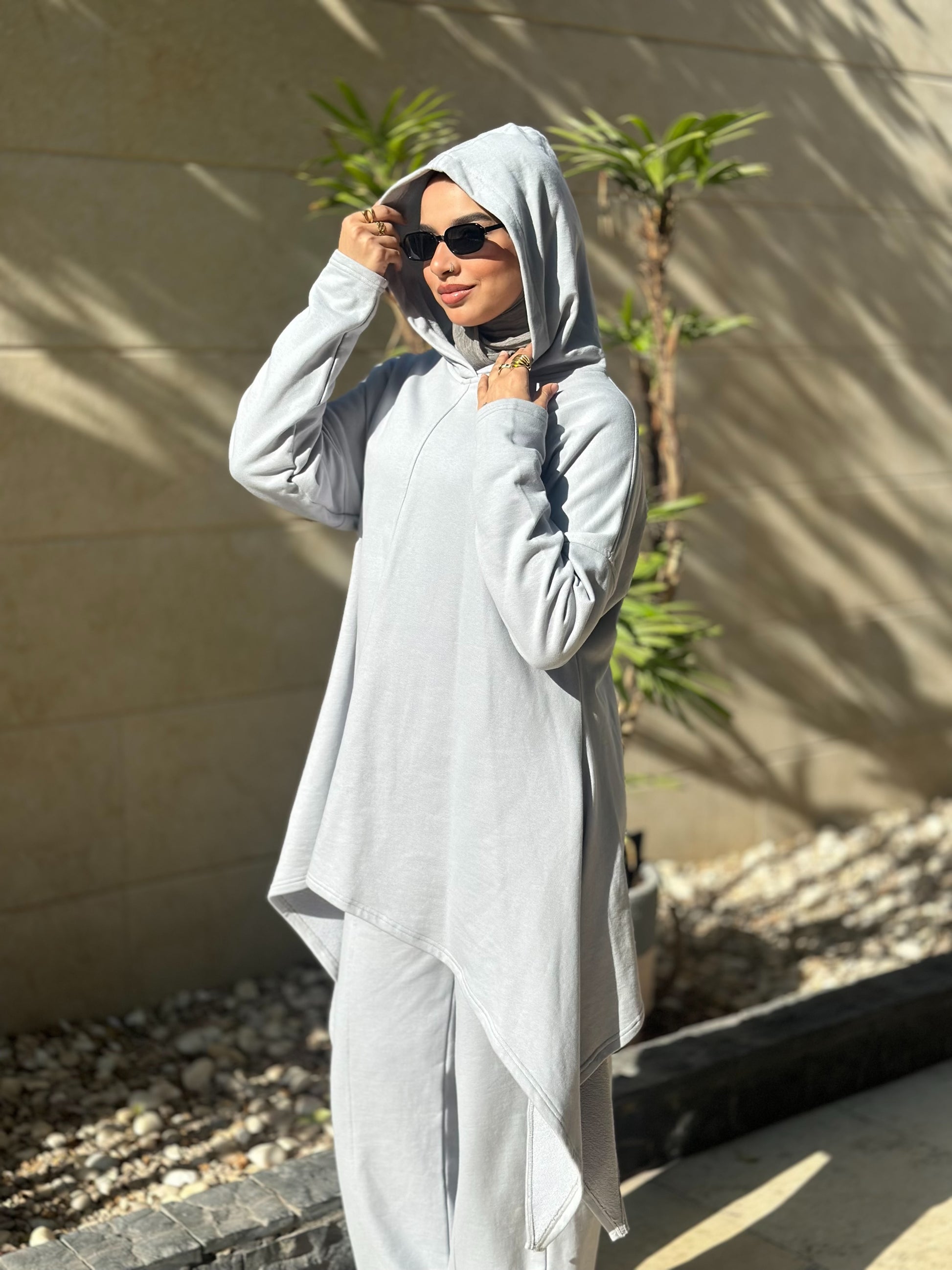 The top comes in a loose, graceful cut with an attached hood, giving you an easy, effortless look you can slip into any day.